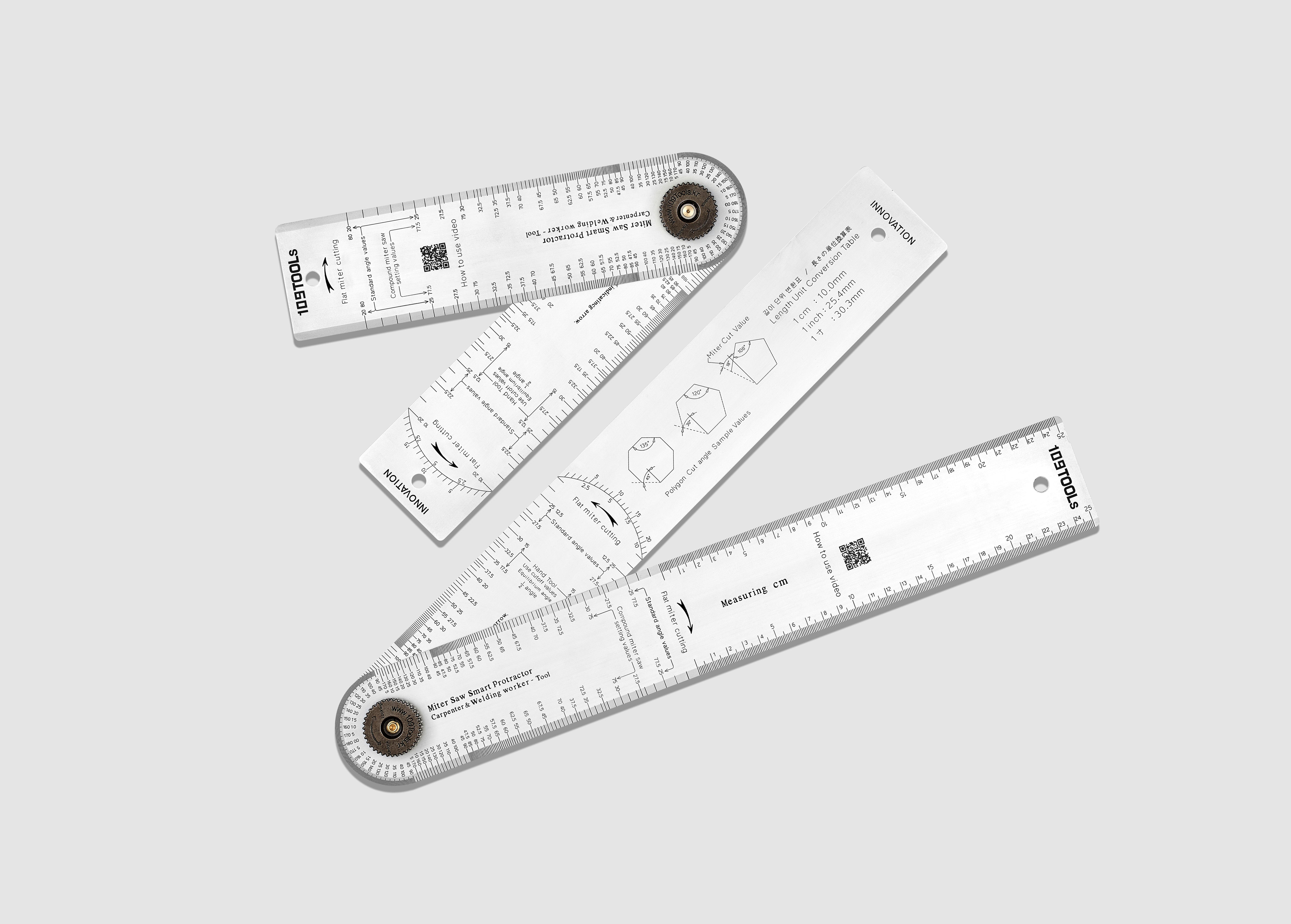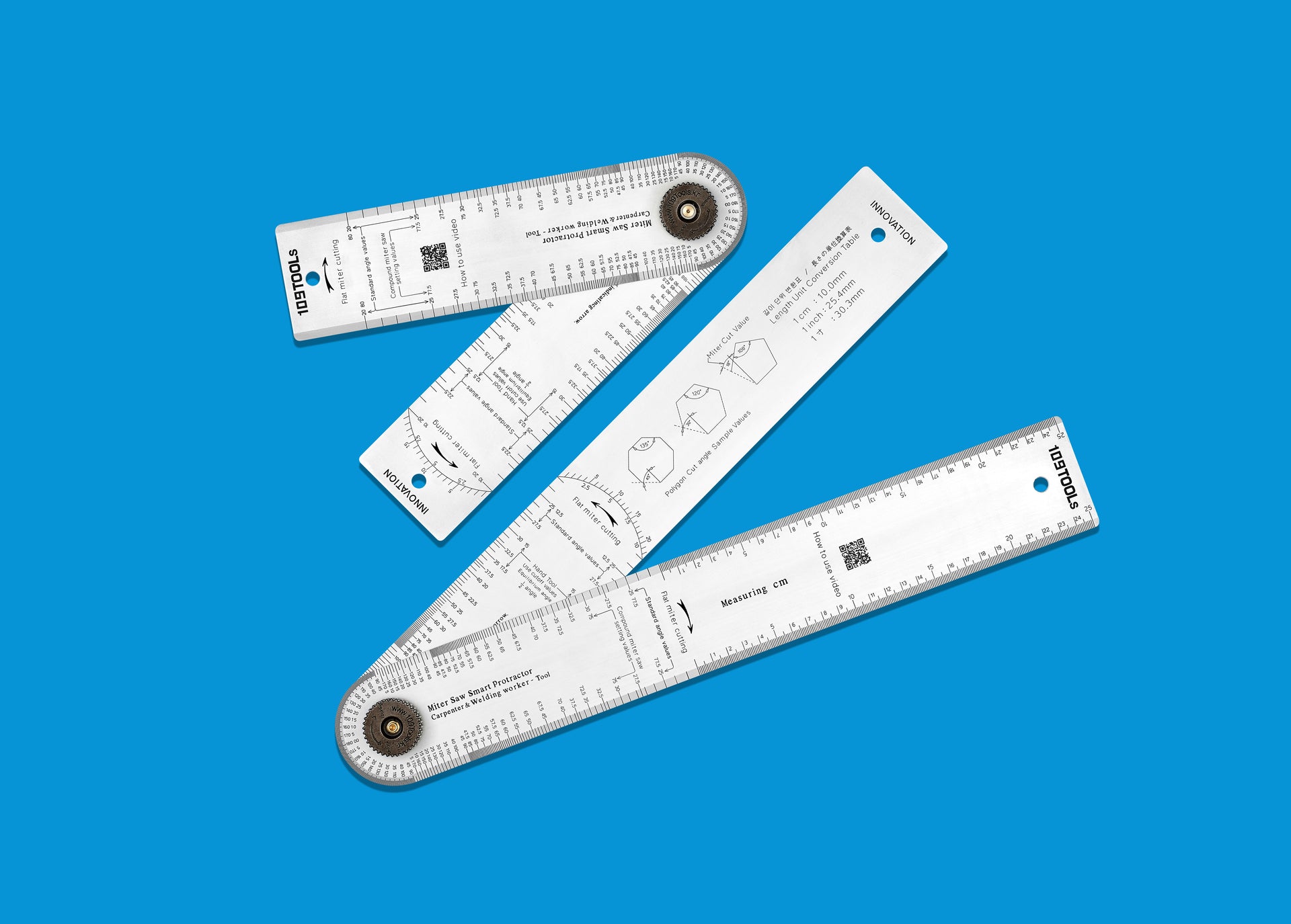 109Tools Miter saw protractor is equipped with standard angle value scales on both sides of the arms, and left and right edges.