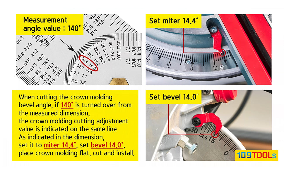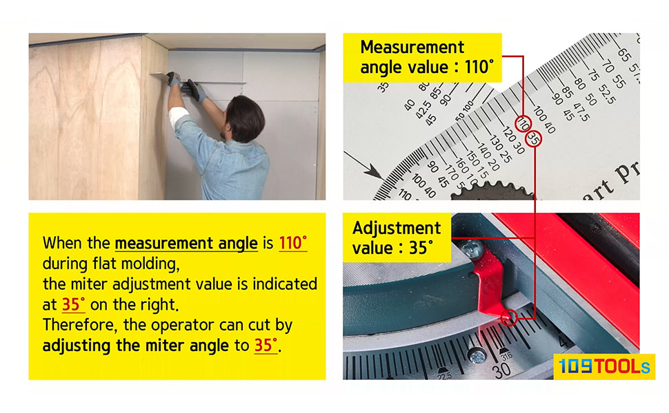 109Tools Miter saw protractor can rotate 360° to measure and find any internal or external angle. Suitable for most materials or surfaces. The Protractor can provide measurement angle value dimension on the scale and four different miter cut values next to the scale. Features 109Tools Miter saw protractor is equipped with standard angle value scales on both sides of the arms, and left and right edges. These scale graduations and slope measurements are based on the standard angle notation scale. Angles (Miter) are measured so that the angle value can be cut flat as well as perform compound miter cuts. In order to provide ease of use for miter cuts, four types of miter cut values are indicated in two rows that are marked on the two arms for easy cutting of the measured angle to the grid. Easily perform accurate miter cutting work without a jig.